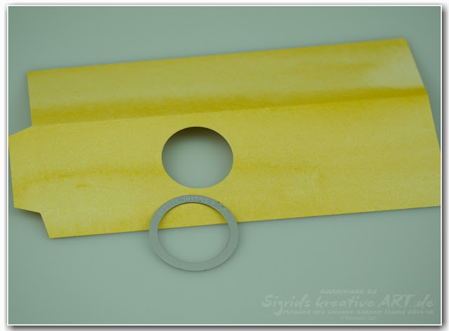 Um das Loch noch hübsch umrahmen zu können, habe ich mit dem passenden Wellenkreis und dem benutzten Kreis einen kleinen Rand in passender Farbe aus den Resten gestanzt.