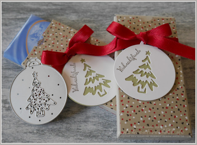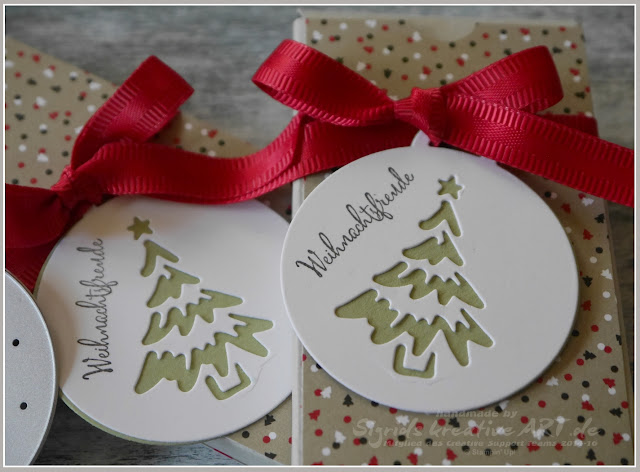 Bei meiner Variante runden ein Geschenkband und ein Anhänger die Verpackung ab.