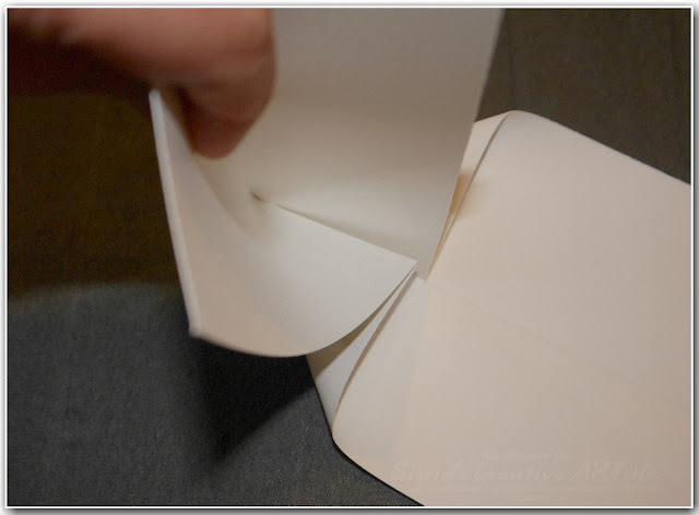 Wenn das Papier perfekt liegt, musst du das rechte Feld nach innen knicken, so dass du dass weiße Innenteil sehen kannst. Kleber nur auf dem gestrichelten Feld aufgetragen und das Papier dann wieder zurück falten und fest gekleben.
